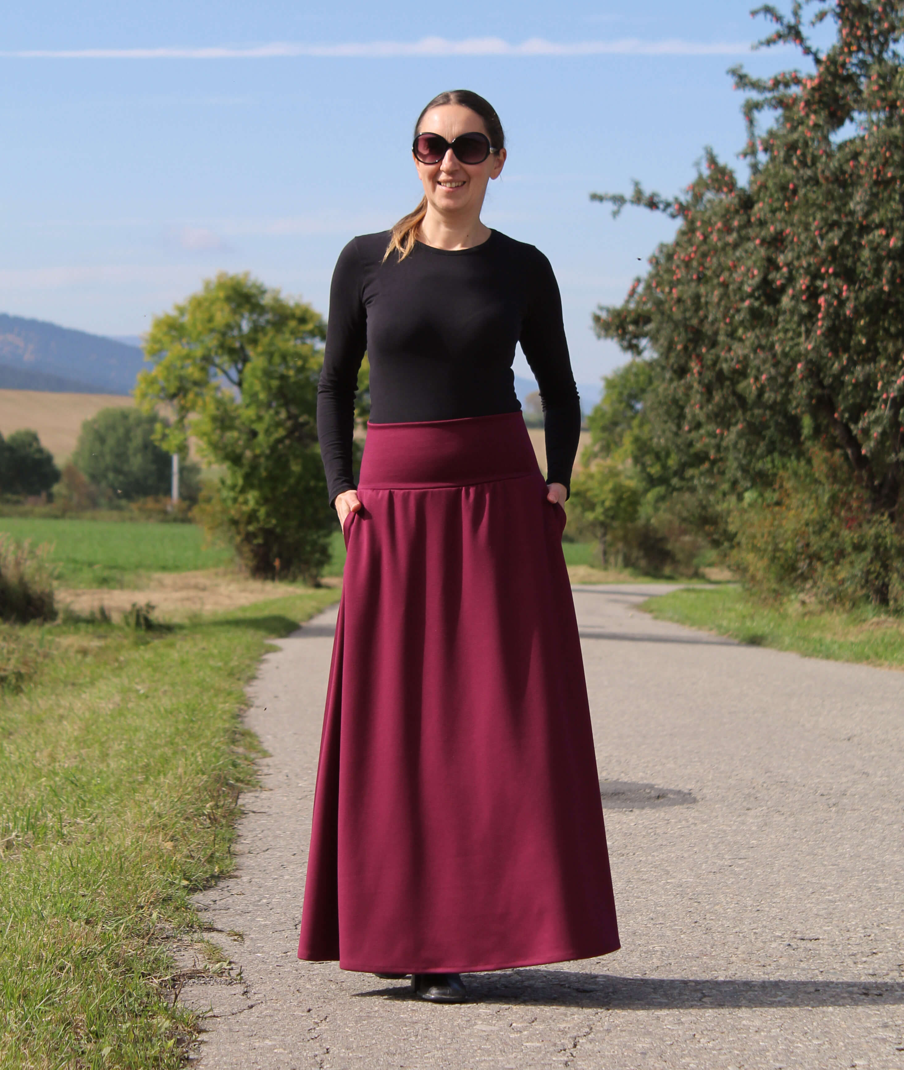 Sukňa je ušitá z príjemného viskózového úpletu vínovej farby.  Je A-čkového strihu. V bočných švíkoch sú vsadené vrecká. V hornej časti je pružný úpletový pás, takže sa pekne prispôsobí postave. Sukňa je veľmi pohodlná na nosenie. Vhodná na prechodné a zimné obdobie.