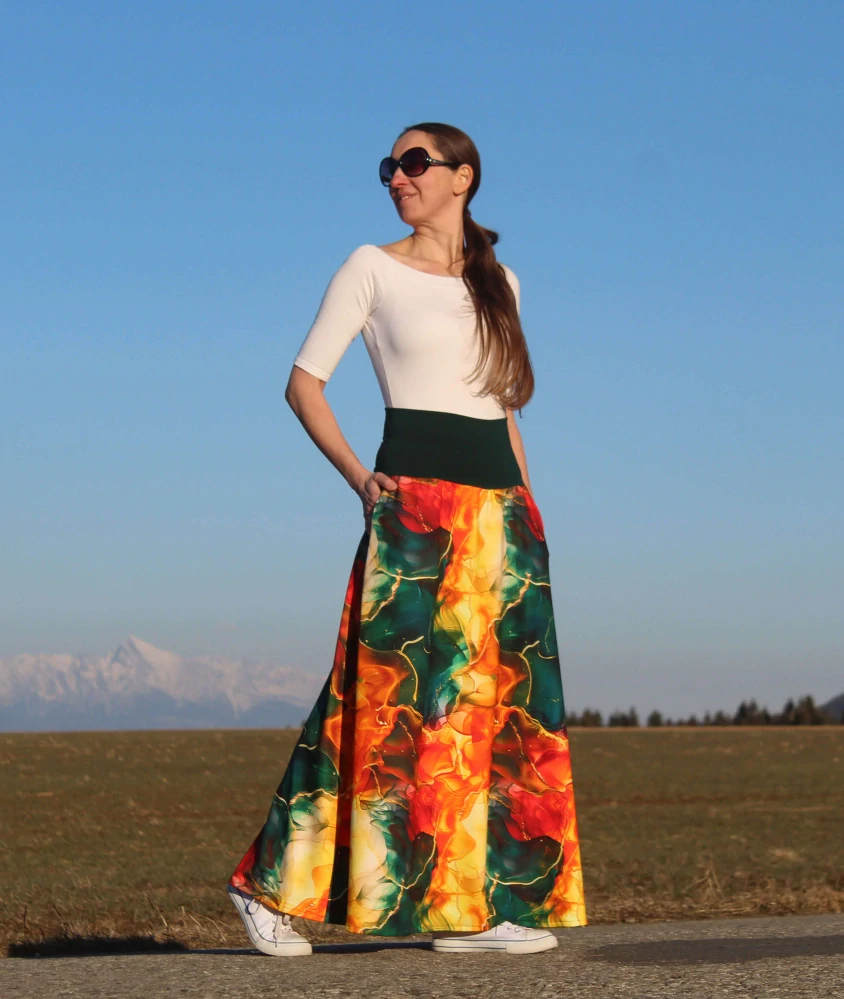 Veľmi pohodlná a ľahká A-čková sukňa ušitá z príjemného šlachteného polyesterového úpletu (94 % polyester, 6 % elasten) s abstraktným vzorom z dizajnovej limitovanej edície. Sukňa je na dotyk mäkká, príjemná, padavá, výborne pruží čím sa vie prispôsobiť postave. V bočných švíkoch sú vsadené vrecká. V hornej časti je pružný úpletový pás, takže sa pekne prispôsobí postave. Sukňa sa nekrčí a je nenáročná na údržbu. Sukňa je v sýtych, žiarivých farbách, takže sa pekne hodí k jednofarebným kúskom oblečenia a oživý celkový outfit.