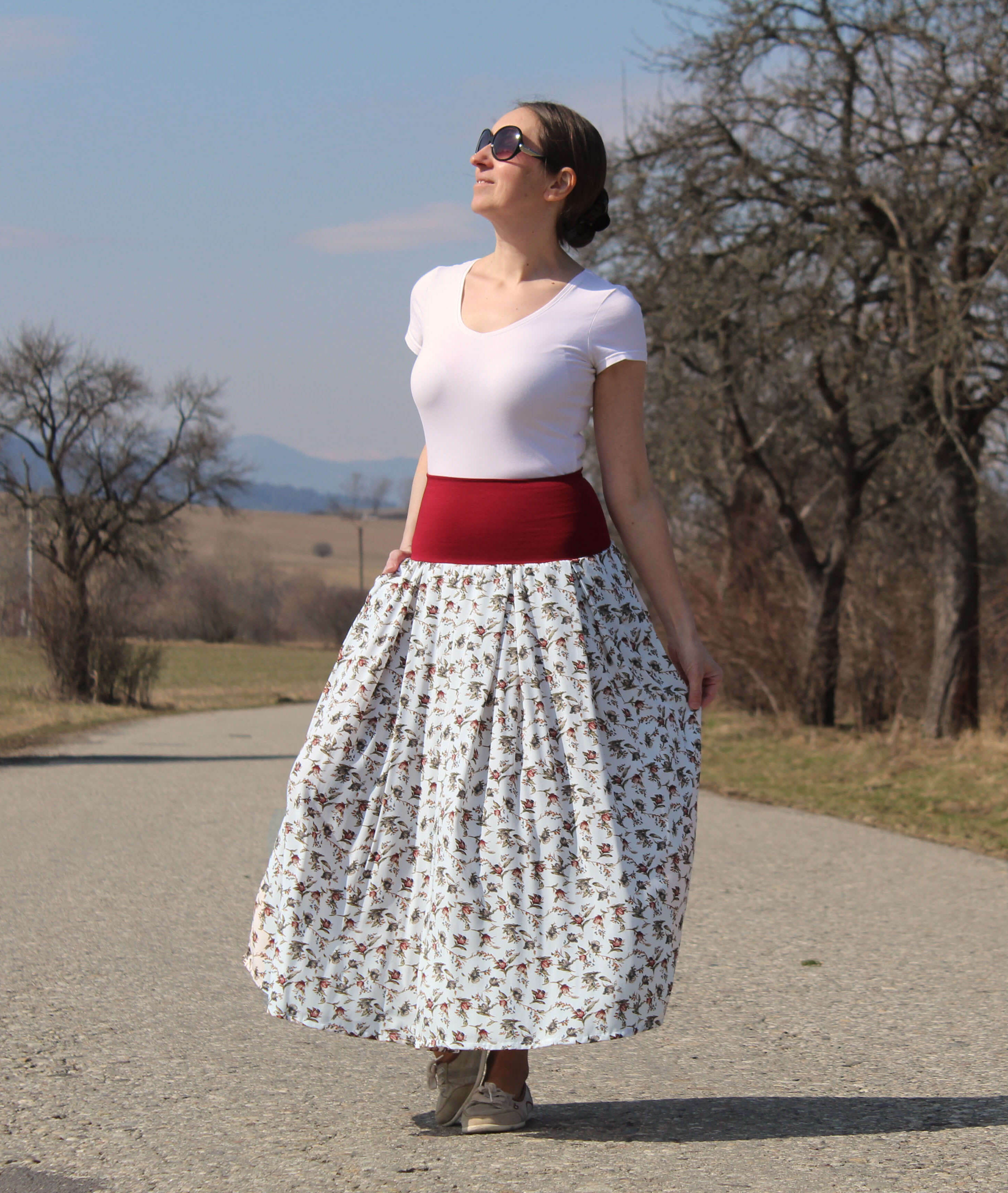 Sukňa je ušitá zo vzorovanej viskózy. Je skladaná. V bočných švíkoch sú vsadené vrecká. V hornej časti je pružný úpletový pás, takže sa pekne prispôsobí postave. Sukňa je ľahučká, vzdušná, vhodná na horúce letné dni.
