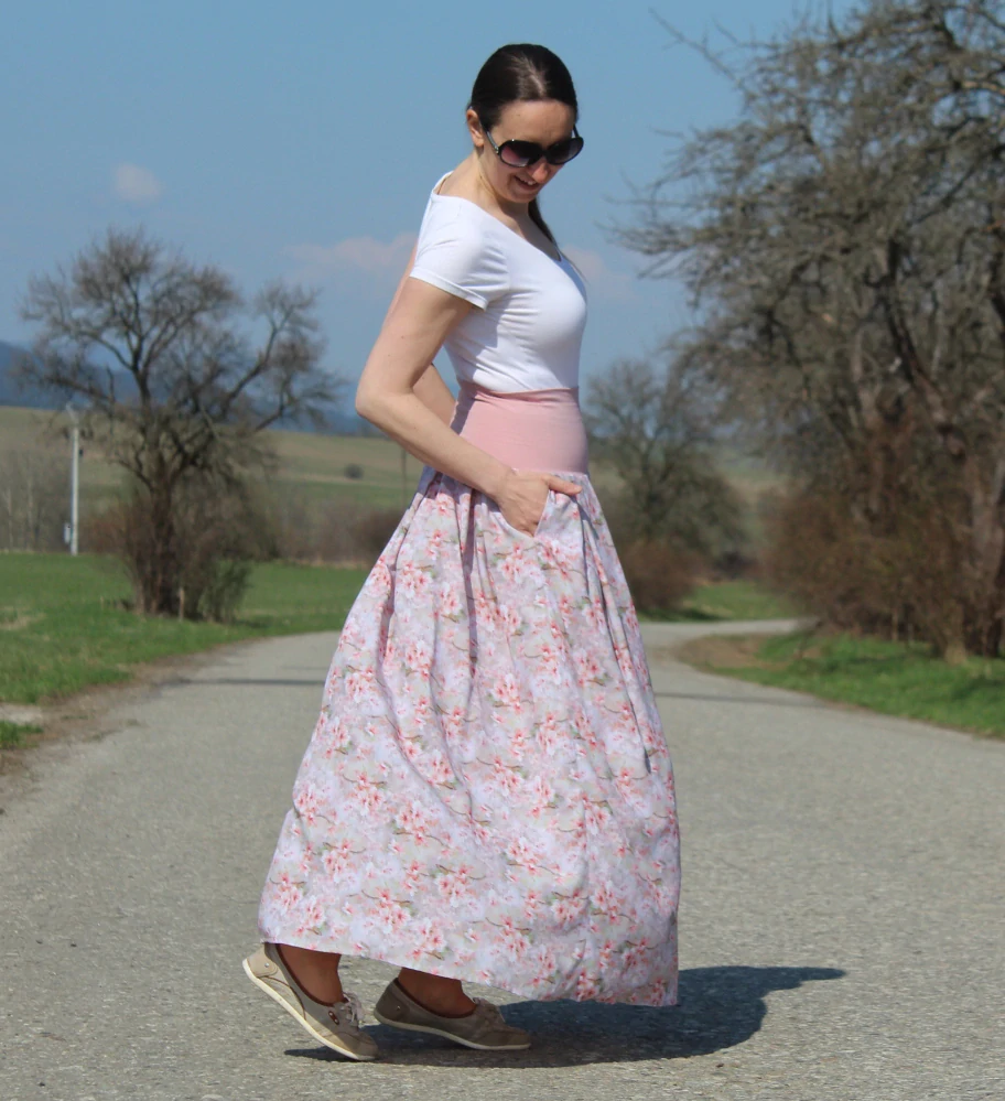 Sukňa je ušitá zo vzorovanej viskózy. Je skladaná. V bočných švíkoch sú vsadené vrecká. V hornej časti je pružný úpletový pás, takže sa pekne prispôsobí postave. Sukňa je ľahučká, vzdušná, vhodná na horúce letné dni.