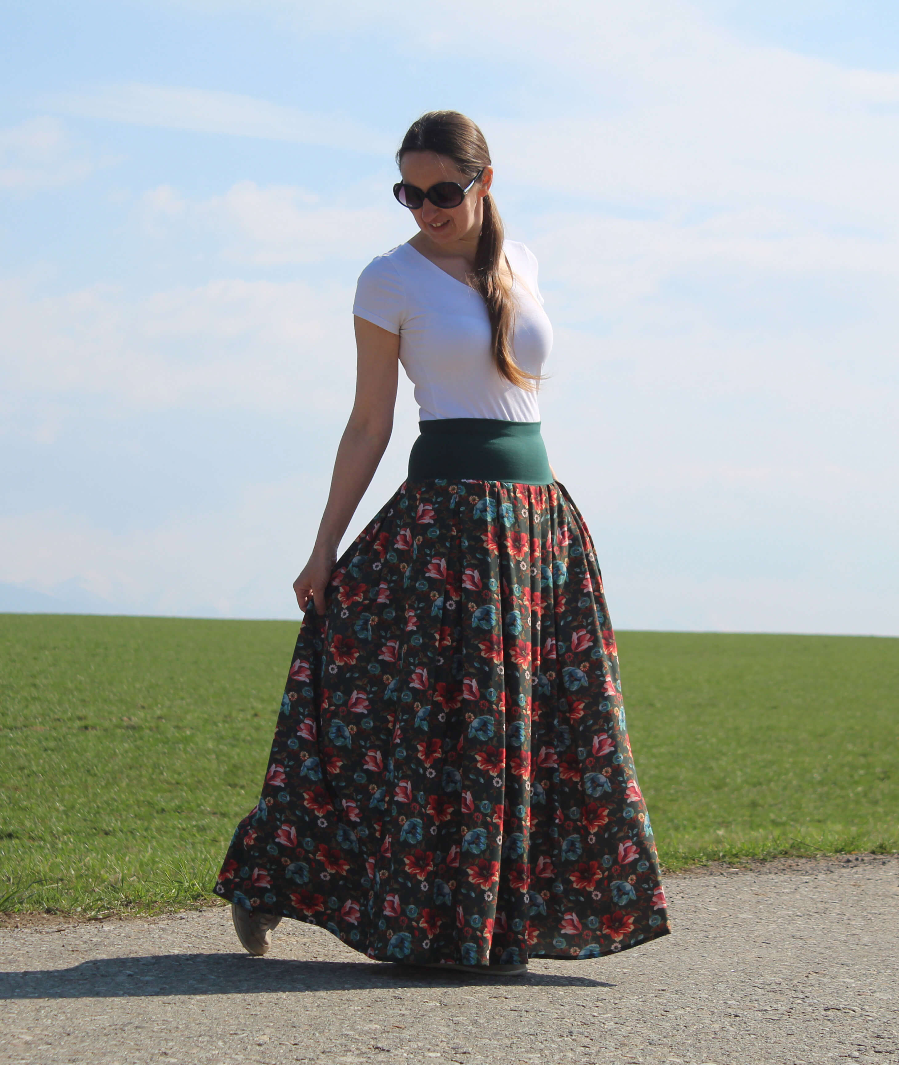 Sukňa je ušitá zo vzorovanej viskózy. Je skladaná. V bočných švíkoch sú vsadené vrecká. V hornej časti je pružný úpletový pás, takže sa pekne prispôsobí postave. Sukňa je ľahučká, vzdušná, vhodná na horúce letné dni.