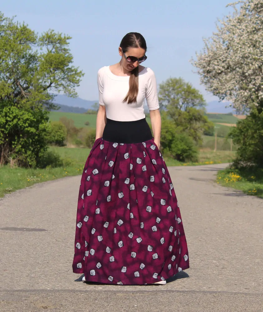 Sukňa je ušitá zo vzorovanej viskózy. Je skladaná. V bočných švíkoch sú vsadené vrecká. V hornej časti je pružný úpletový pás, takže sa pekne prispôsobí postave. Sukňa je ľahučká, vzdušná, vhodná na horúce letné dni.