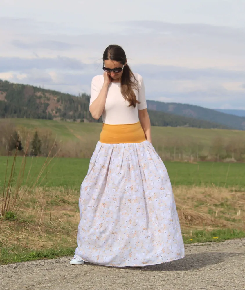 Sukňa je ušitá zo vzorovanej viskózy. Je skladaná. V bočných švíkoch sú vsadené vrecká. V hornej časti je pružný úpletový pás, takže sa pekne prispôsobí postave. Sukňa je ľahučká, vzdušná, vhodná na horúce letné dni.