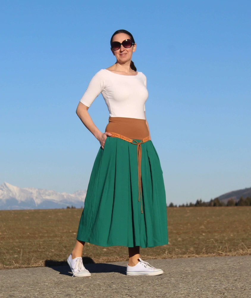 Trojštvrťová, ľahká a vzdušná skladaná sukňa, ušitá zo zmesovej šatovky. Sukňa je veľmi pohodlná na nosenie. Sukňa je ľahká a mierne chladivá, čo oceníte najmä počas leta. Vyšší komfort zabezpečujú vrecká, ktoré sú všité v bočných švíkoch. V hornej časti je pružný pás, takže sa pekne prispôsobí postave. Sukňa je zelenej farby so svetlohnedým pásom. Dozdobená je opaskom.